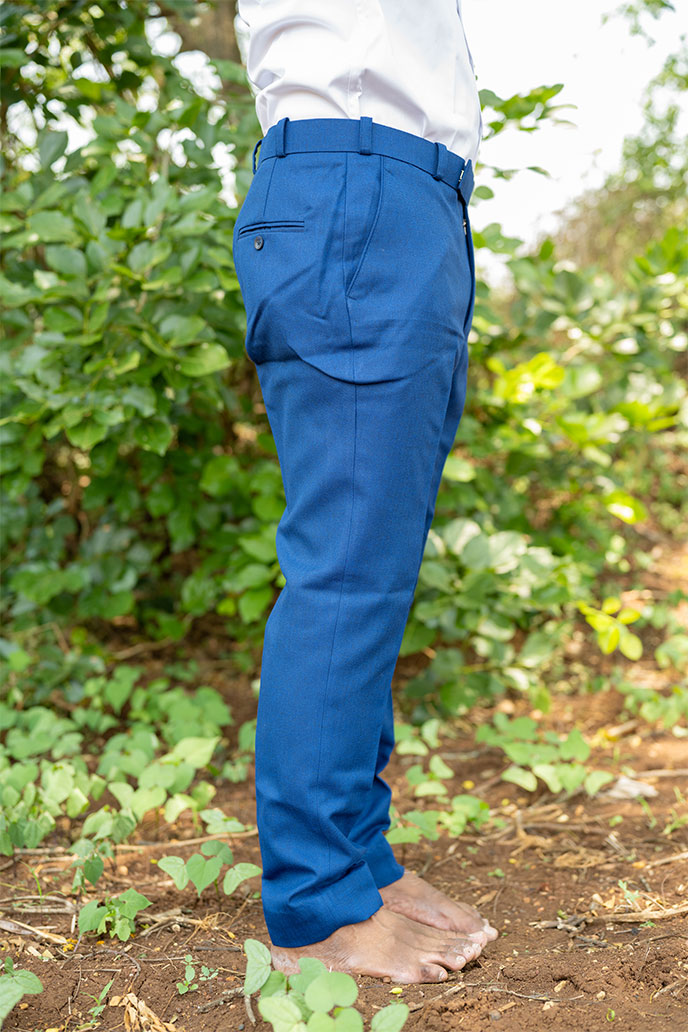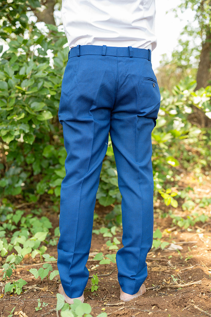 Crafted from premium wool, these deep blue trousers redefine sophistication and versatility. Designed for a perfect fit, they feature a structured silhouette with a classic crease, offering a refined look for both professional and formal occasions. The rich hue adds depth to any ensemble, while the breathable wool fabric ensures comfort throughout the day. Finished with functional pockets and a seamless closure.