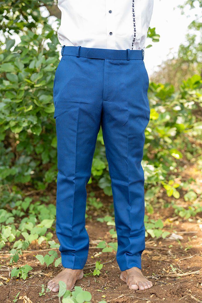 Crafted from premium wool, these deep blue trousers redefine sophistication and versatility. Designed for a perfect fit, they feature a structured silhouette with a classic crease, offering a refined look for both professional and formal occasions. The rich hue adds depth to any ensemble, while the breathable wool fabric ensures comfort throughout the day. Finished with functional pockets and a seamless closure.